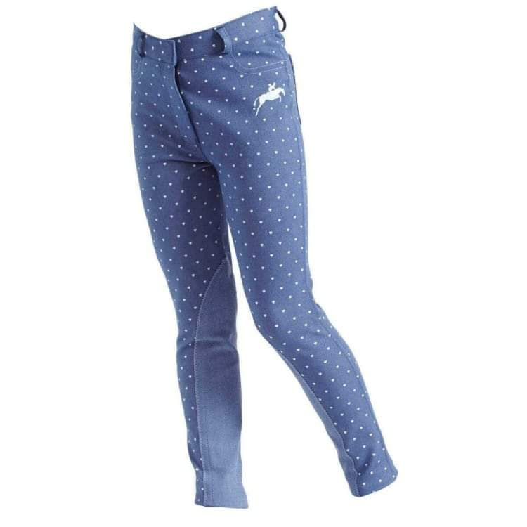 These pull on jodhpurs make it easy for junior riders to dress themselves and feature a cool tonal heart print. Made from a soft woven fabric for added comfort these jodhpurs also have self fabric knee patches, rear patch pockets and belt loops. 61% cotton, 33% polyester, 6% elastane